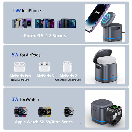 3 in 1 Wireless Charging Station for Apple Foldable Magnetic Travel Charger Multiple Devices for iPhone 15/14-12 iWatch AirPods