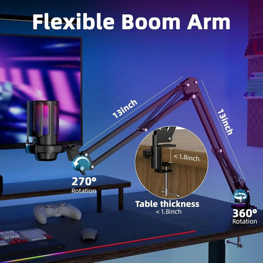 USB Gaming Microphone with Arm Stand Live Reverb Function Mute RGB Condenser Microphones for LiveStreaming Games Audio Recording