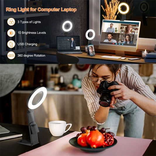 USB LED Selfie Light Clip Ring Light with Phone Holder Desktop Ring Light for Computer Laptop Video Conference Lighting Makeup